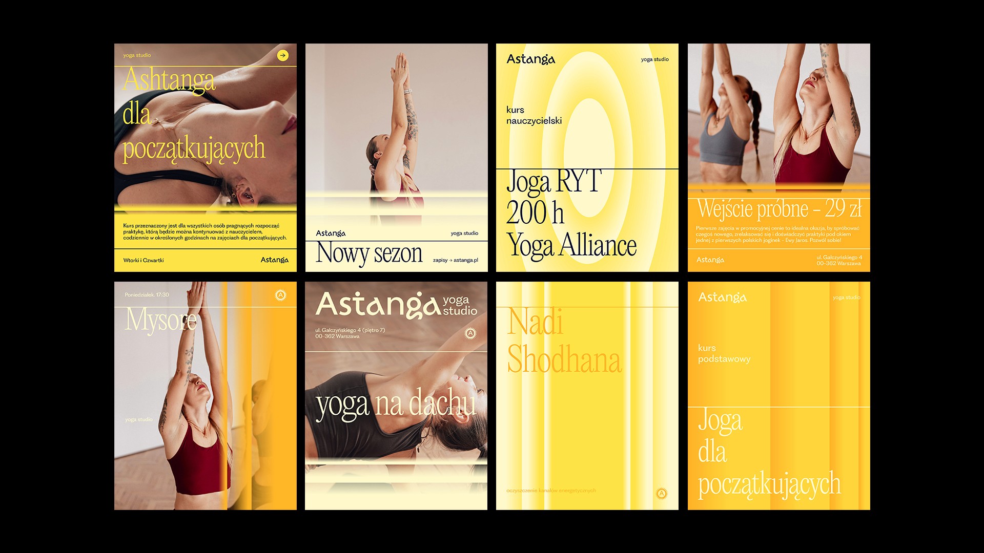 Inspiracją do stworzenia logotypu były bezpośrednio pozycje, które znajdziemy w jodze ashtanga. Chcieliśmy przenieść ruch postaci tworząc dynamiczną formę typograficzną, jednocześnie zachowując maksimum czytelności.