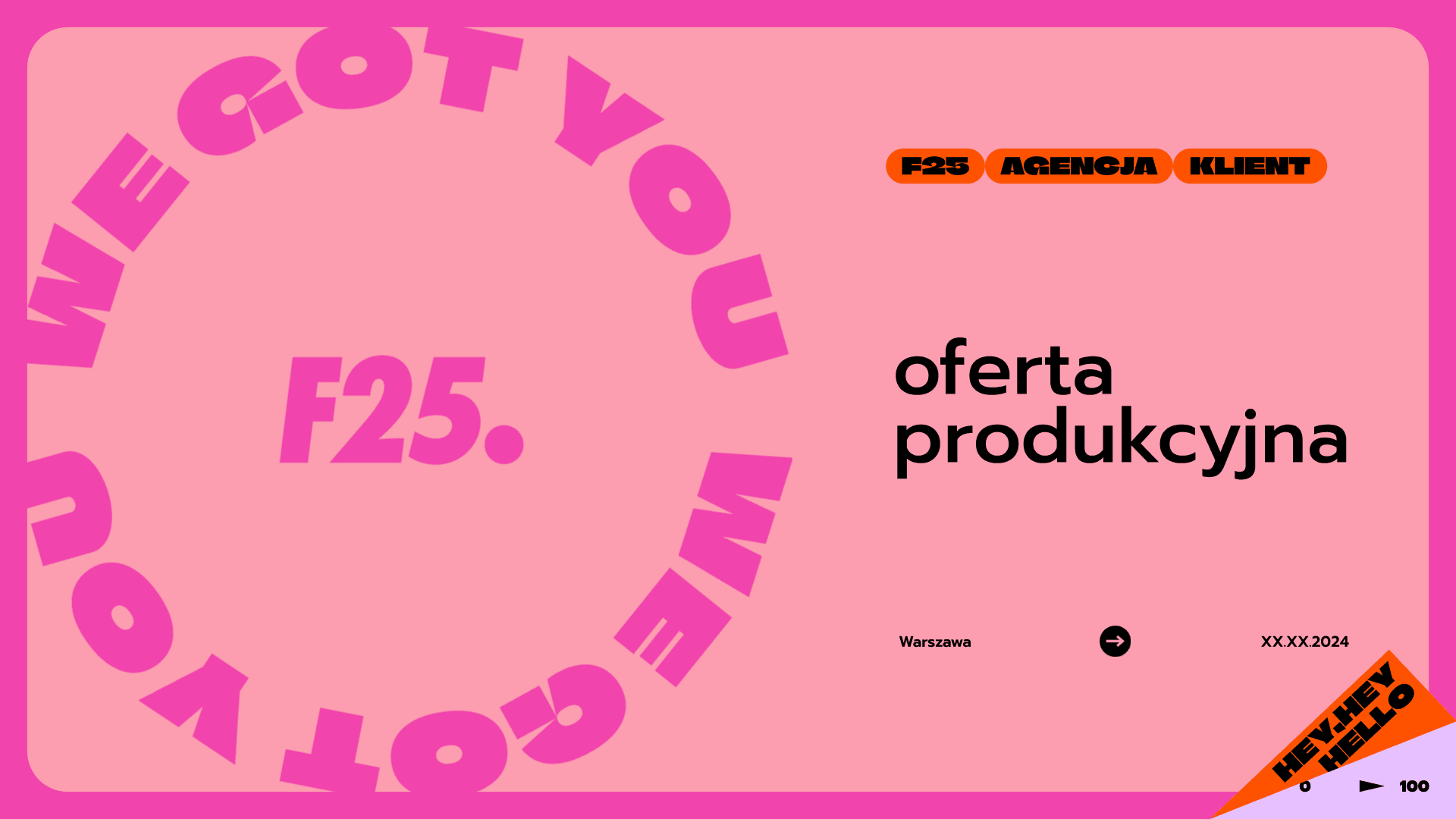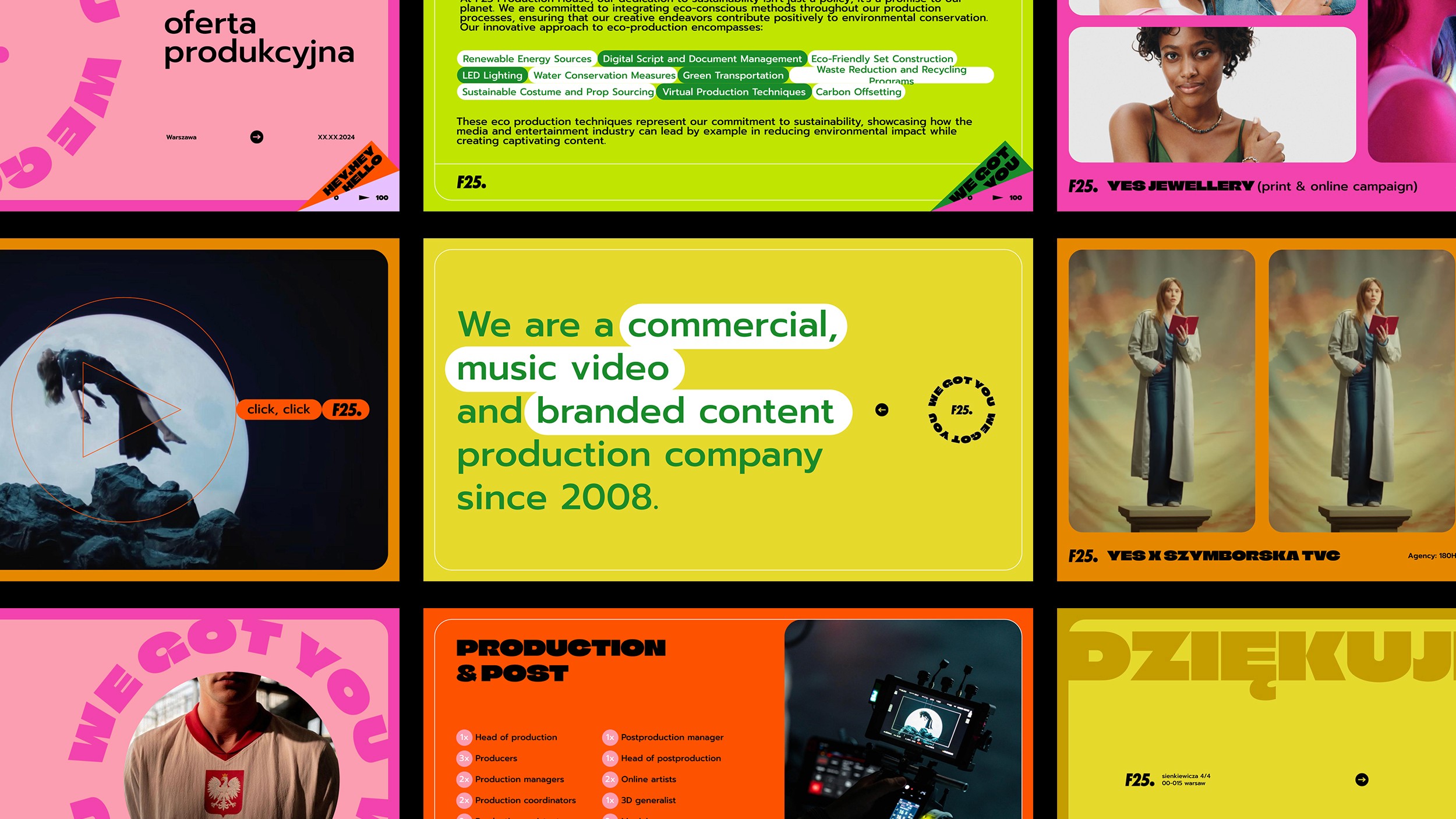 F25 to warszawski dom produkcyjny specjalizujący się w kompleksowej produkcji filmowej oraz wideo - od multimedialnych kampanii reklamowych po interaktywne treści digital. Działa od 2008 roku, łącząc kreatywność z pełnym serwisem produkcyjnym i postprodukcyjnym dla marek lokalnych i międzynarodowych.
