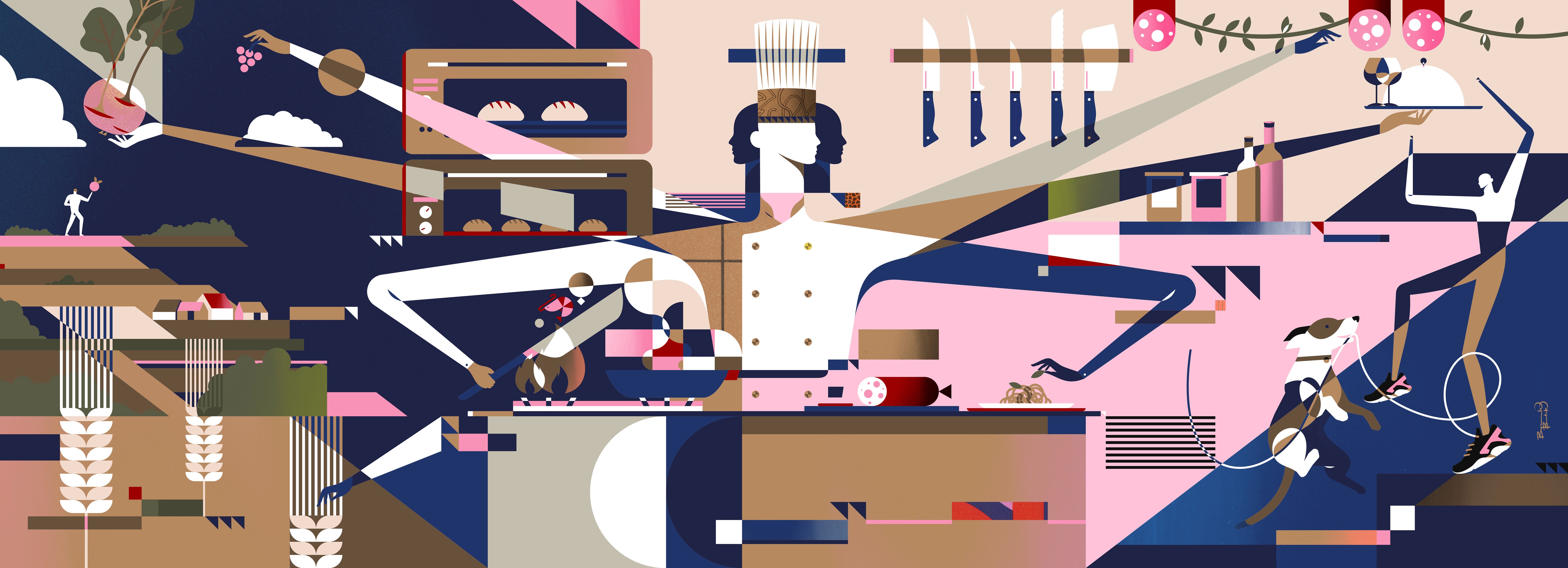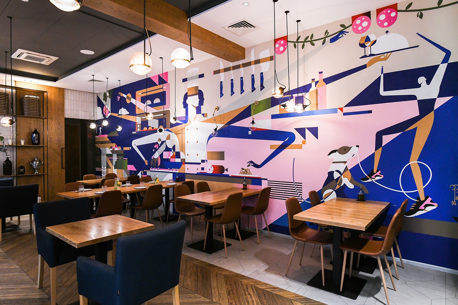 Kluczowym elementem projektu jest kolorystyka. Paleta składa się z delikatnych odcieni piaskowych oraz chlebowych wywodzących się od semoliny połączonych z żywymi różami, granatem oraz zielenią, co stanowi idealny miks kulinarny - aż chce się jeść.